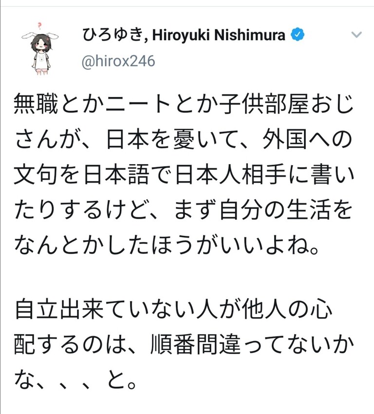 西村ひろゆき「こども部屋おじさんは日本を心配する前に自分の人生を心配しないと」 お前らに痛恨の一撃