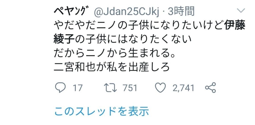 ジャニオタ「ニノの子供に生まれたいけど伊藤綾子の産道は通りたくない…ニノが産め!この私を!」