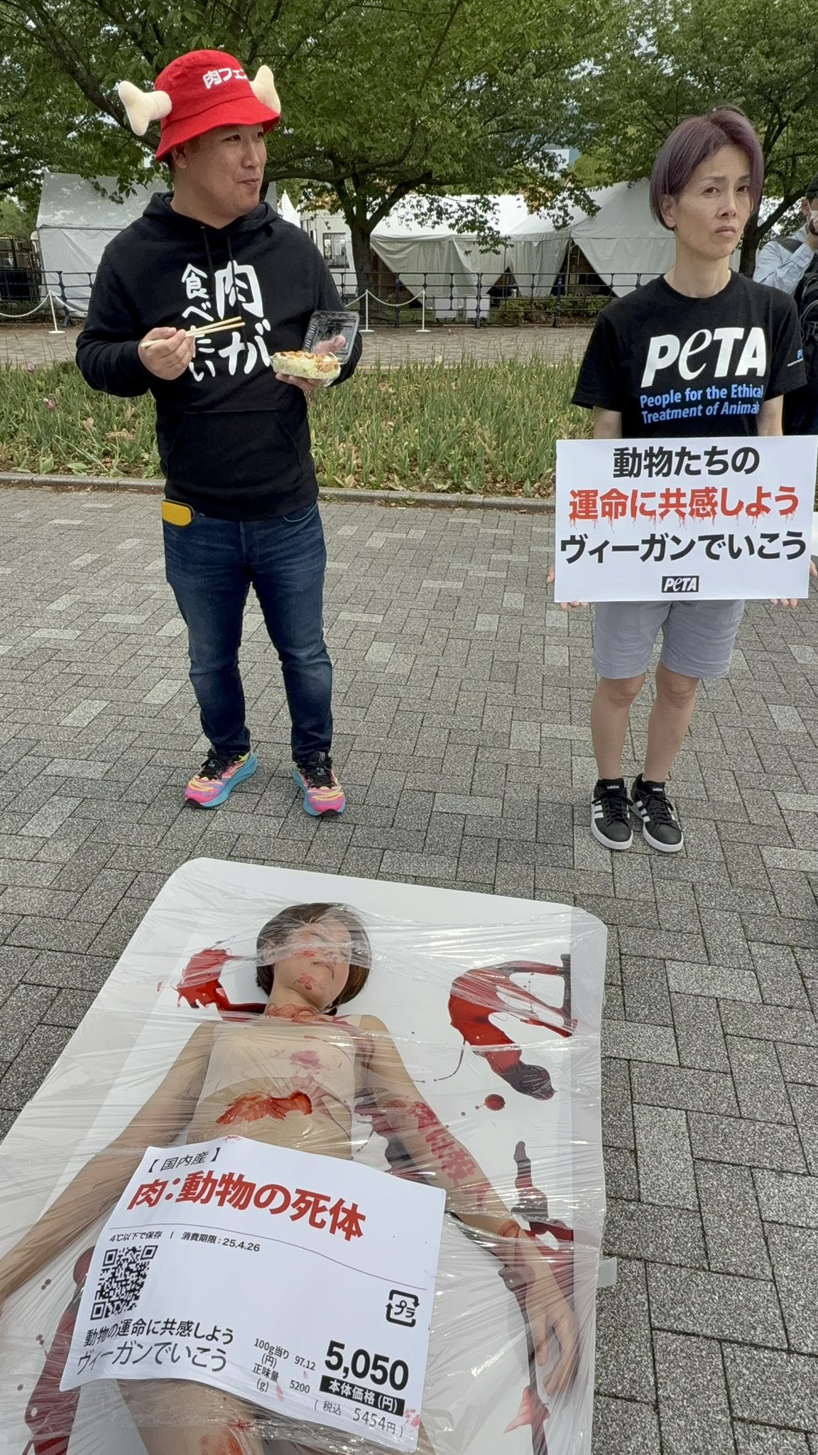「肉:動物の死体」ヴィーガン団体が女性パック詰めパフォーマンス、血のりも 肉フェスで