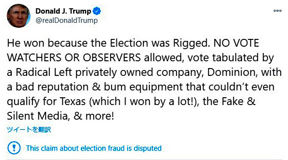 米大統領選をめぐり、トランプ大統領は15日、「彼が勝利したのは、選挙が不正だったからだ」とツイートした。「不正選挙」という留保をつけているが、バイデン次期大統領の勝利を初めて、事実上認めた形だ。(省略)全文