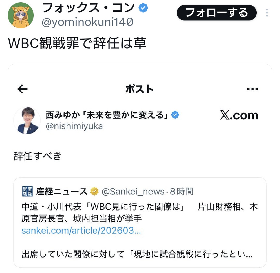 パさん「WBC見に行った閣僚は辞任すべき」...