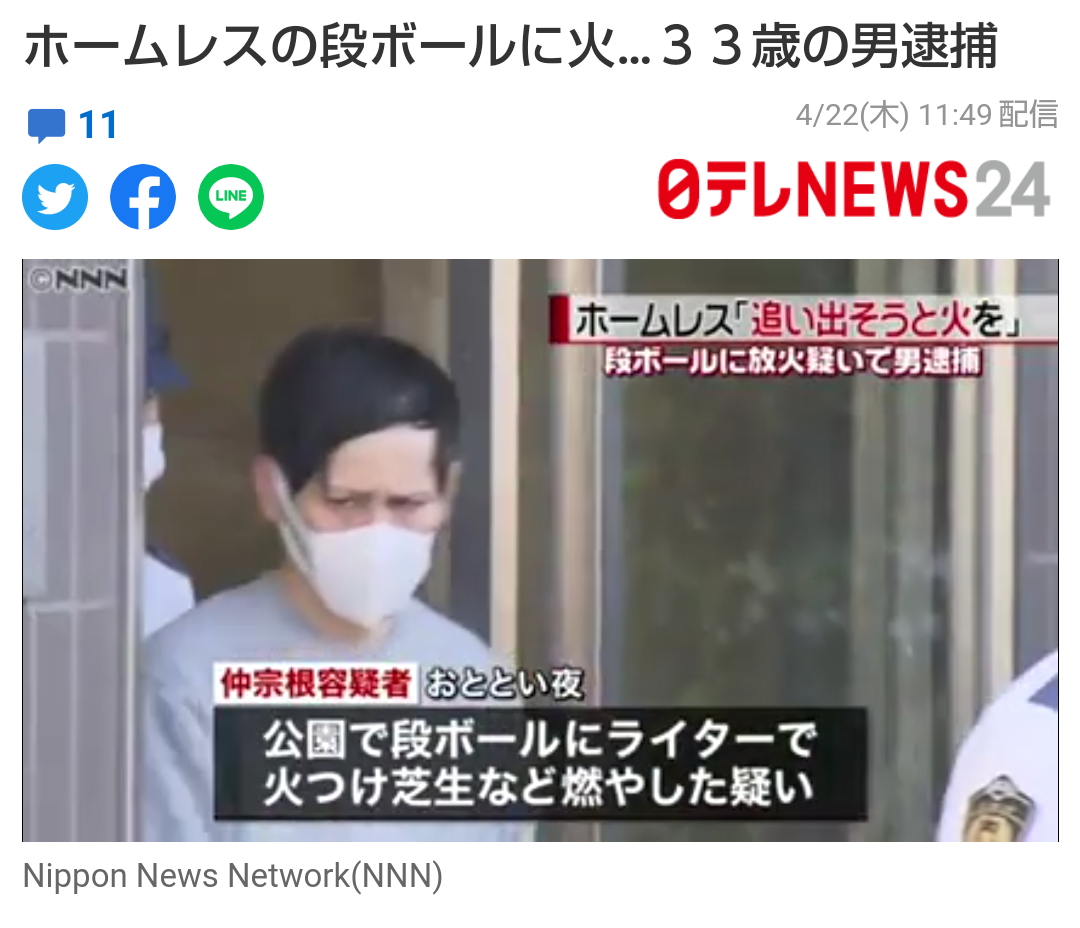 東京・足立区の公園で、ホームレスの人が使っていた段ボールに火をつけたとして、33歳の男が現行犯逮捕されました。