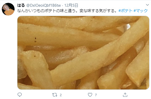 12月に入ってからマクドナルドの「ポテトの味が変わった」、「変な味がする」、「ニベアみたいなクリームの香りがする」、「ニベアみたいなクリームの香りがする」というツイートが投稿されていた。これは気のせいなのか本当に味が変わっていたのか。この真相を確かめるためにマクドナルドの広報に取材を試みたところ、次のような回答を得られた。(省略)全文