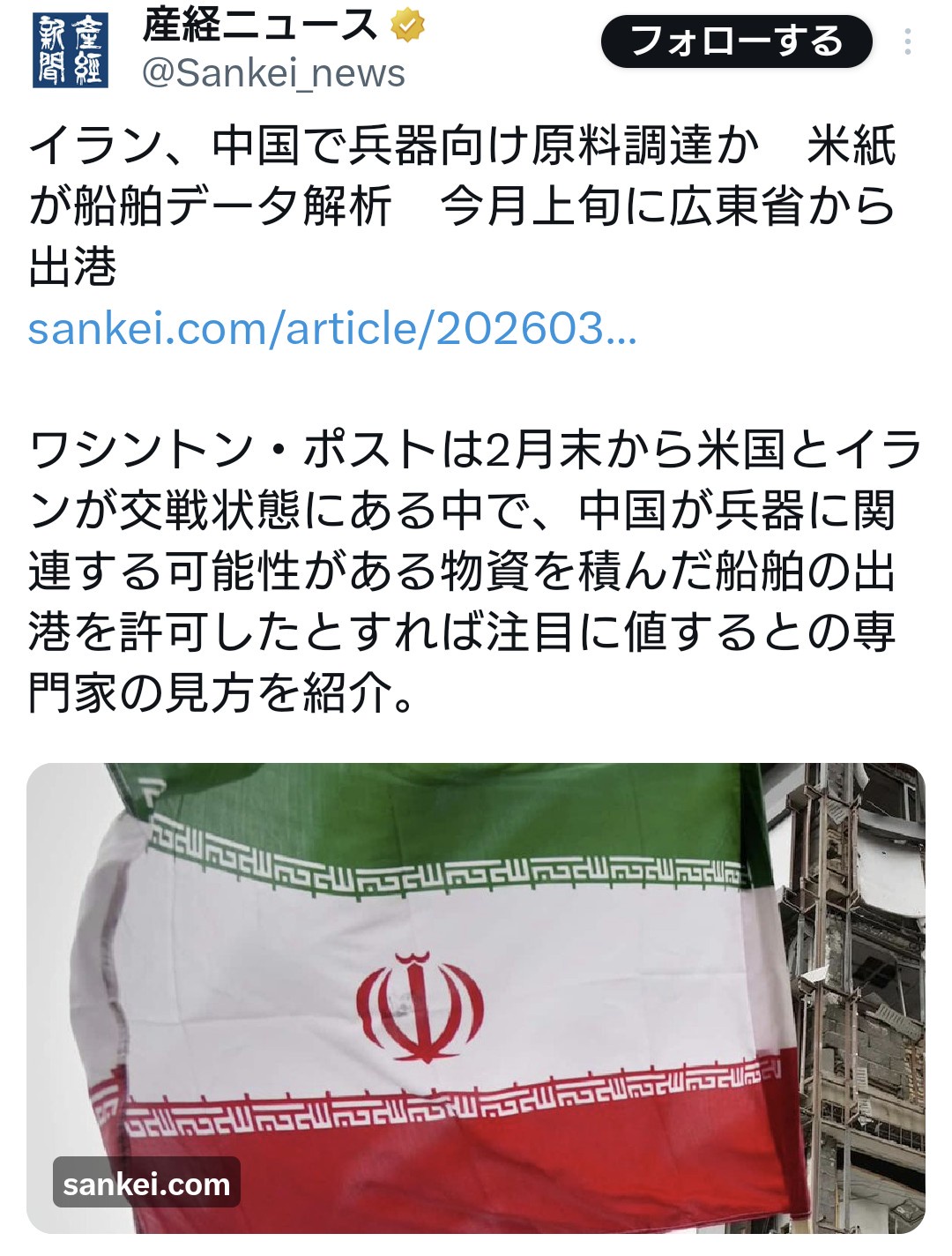 ワシントン・ポストは2月末から米国とイランが交戦状態にある中で、中国が兵器に関連する可能性がある物資を積んだ船舶の出港を許可したとすれば注目に値するとの専門家の見方を紹介。— 産経ニュース (@Sankei_news)
