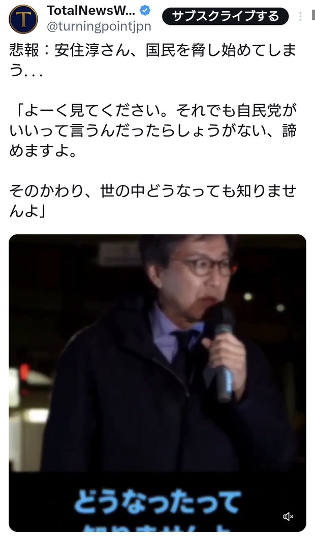 悲報:安住淳さん、国民を脅し始めてしまう...「よーく見てください。それでも自民党がいいって言うんだったらしょうがない、諦めますよ。そのかわり、世の中どうなっても知りませんよ」
