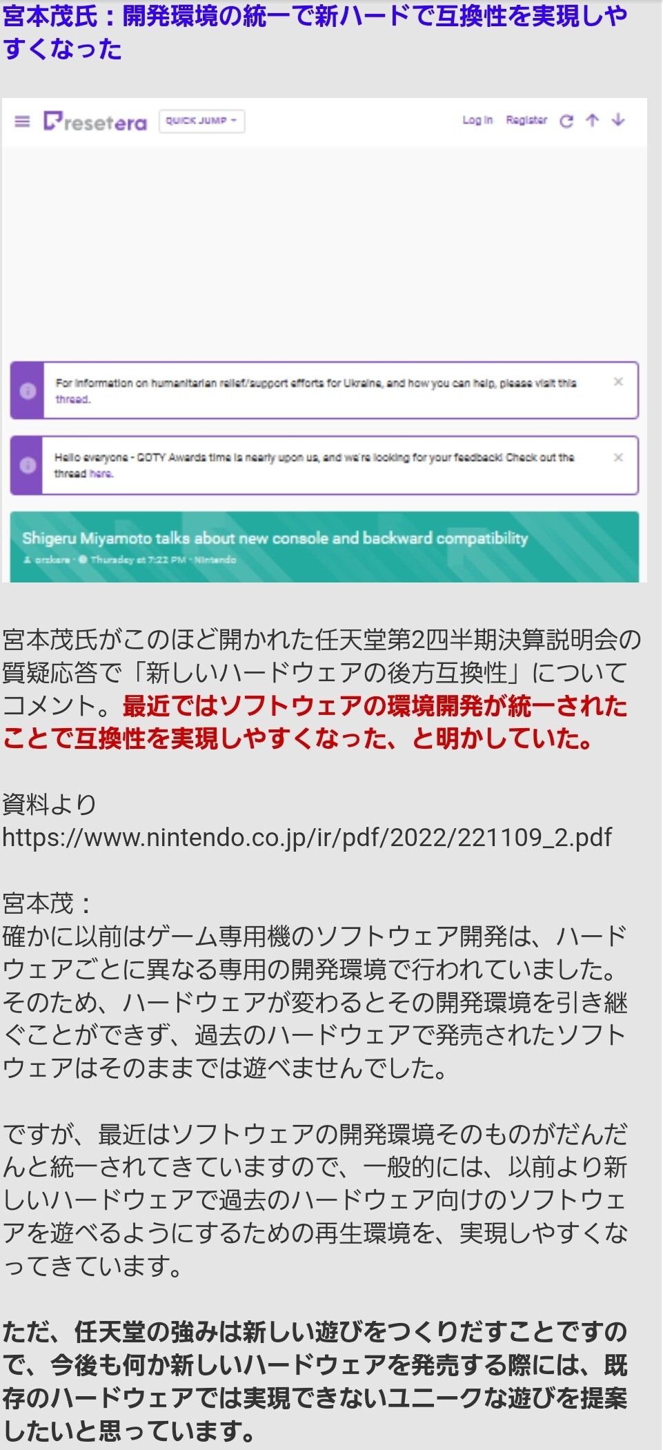 https://www.resetera.com/threads/shigeru-miyamoto-talks-about-new-console-and-backward-compatibility.652821/2 名前:名無しさん@おーぷん[] 投稿日:22/11/13(日) 08:49:34 ID:eOzo携帯ゲーム機でもあるからなゲームボーイ兄さん達みたいに酷使されるんやで5 名前:名無しさん@おーぷん[] 投稿日:22/11/13(日) 08:50:38 ID:TDVr>>2まさか任天堂がこんな化け物ハード出すとは思わなかったわ続きを読む