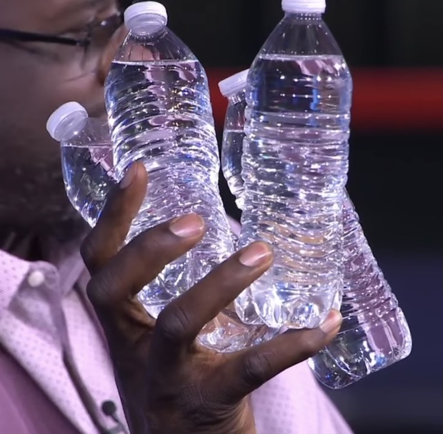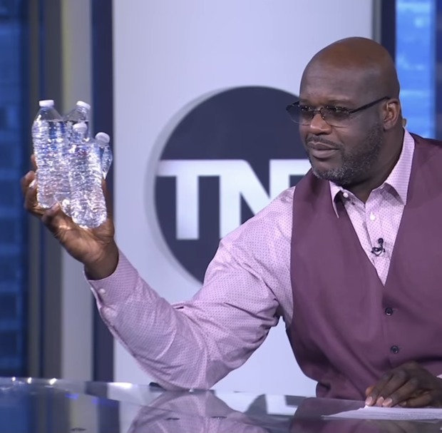 元NBAスター選手のシャキール・オニール(身長216cm)片手でペットボトルを4本も掴んでしまう