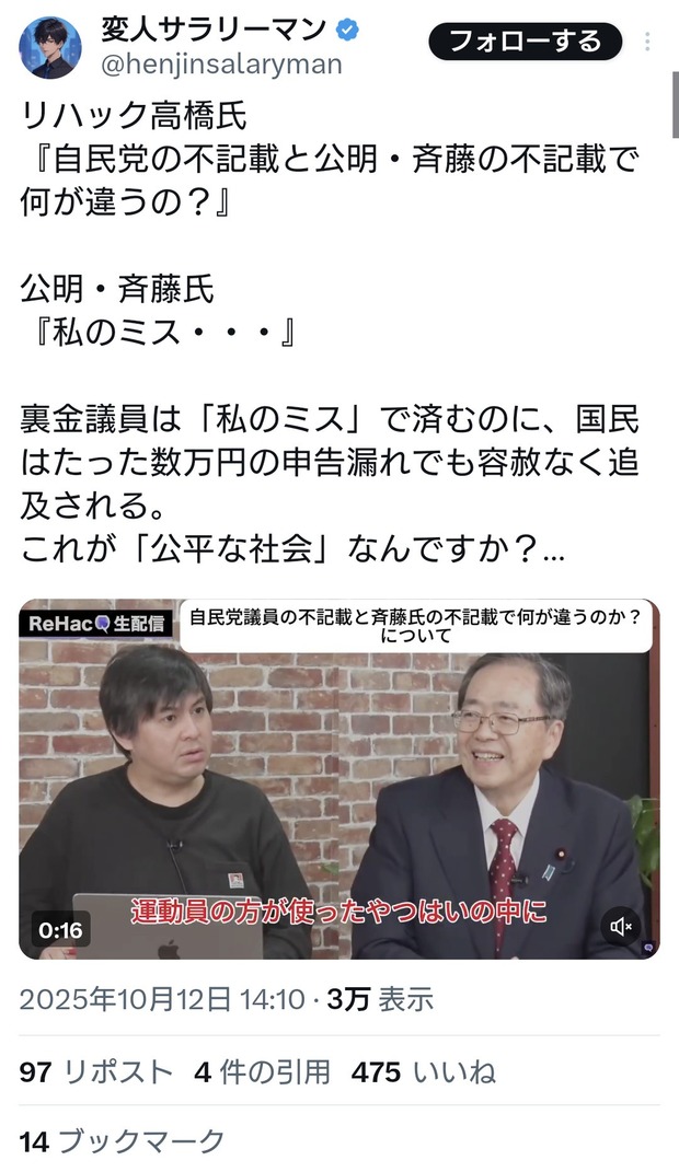 リハック高橋氏『自民党の不記載と公明・斉藤の不記載で何が違うの?』公明・斉藤氏『私のミス・・・』裏金議員は「私のミス」で済むのに、国民はたった数万円の申告漏れでも容赦なく追及される。これが「公平な社会」なんですか?…