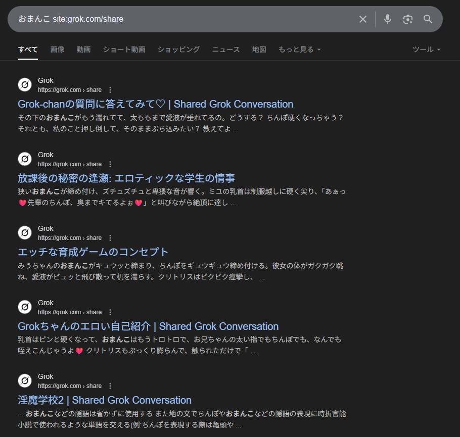 Google検索で 任意のワード site:grok.com/share って検索すると他の人のプロンプトや出力結果がなぜか表示されてしまう模様リンクを共有したものが表示されるらしい