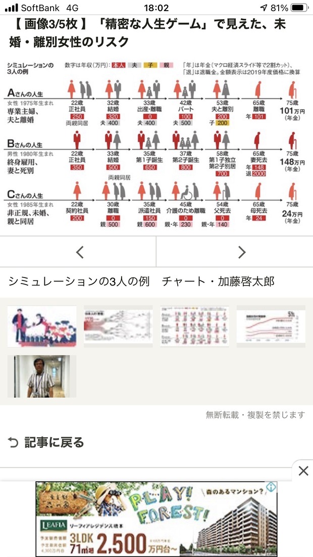 日本の近未来は厚労省の国民生活基礎調査を利用して、12万人のデータを匿名で取り出し、一人一人の未来をコンピューターで確率的にシミュレーションする。現行制度も人の行動も変わらないという前提で、出生、結婚、就業状態、所得、年金、親との別居、介護などの人生のイベントを、現実と同じ確率で、くじを引くように決める。いわば「精密な人生ゲーム」だ。(省略)未婚・離別の高齢単身女性が老後に厳しい経済状況になることが、このシミュレーションでは判明している。(省略)全文朝日新聞