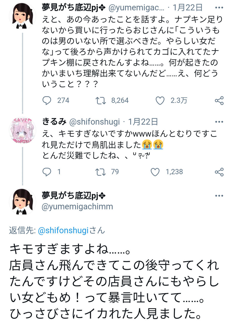 女さん「ナプキン買おうとしたらおじさんに『やらしい女だな』って言われてナプキンを棚に戻された」