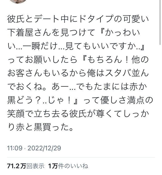 女さん「可愛い下着屋さんを見つけたので寄りたいって言ったら彼氏が優しすぎた」6.5万いいね