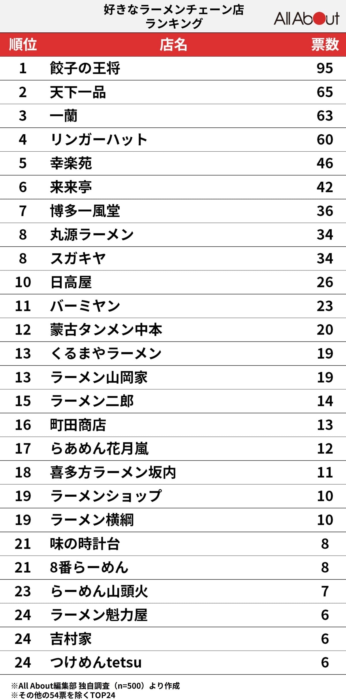 All About編集部では、全国10~60代の男女500人を対象に「好きなラーメンチェーン店」についての独自調査を実施しました
