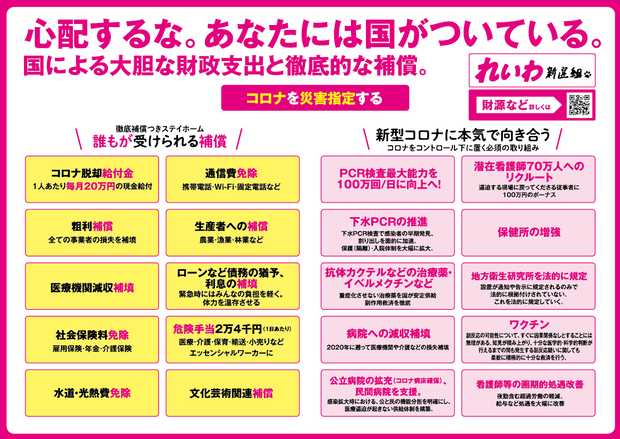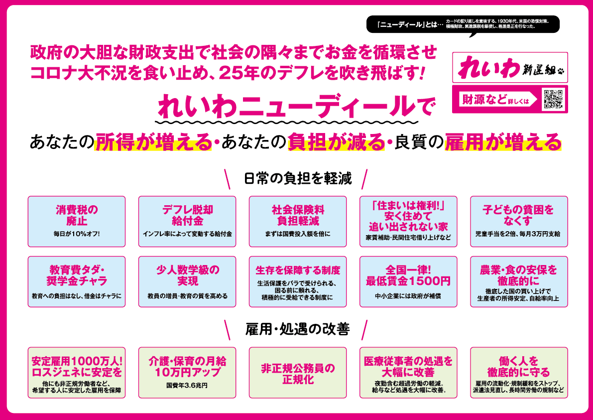 国政政党 れいわ新選組の政策をご確認ください・3ヶ月でコロナを封じこめ!日常を取り戻す・何があっても心配するな。そんな国をあなたと作りたい。れいわ新選組マニフェスト れいわニューディール