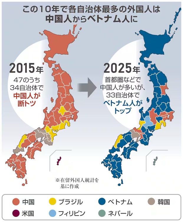 ベトナム人33道県で最多 都道府県別在留外国人分析、中国人は都市集中 各地で多国籍化 日本を守れるか - 産経ニュースhttps://www.sankei.com/article/20260102-FEWPTCXAM5I6ND55NSTHZK2Y3U/