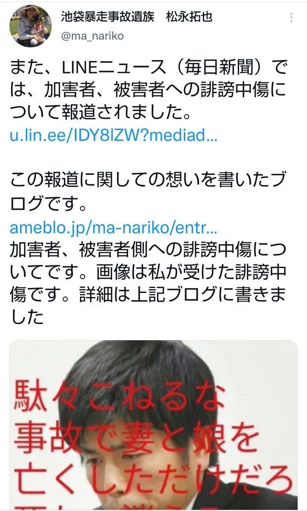 池袋暴走プリウス遺族の松永さん。車カスからたくさんの誹謗中傷を受けていた。