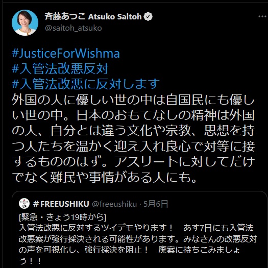 日本を"人権を守る先進国"にしたい、国際人権法に則った法への改正に向けて国会で力を尽くしたい、とウィシュマさんの笑顔の遺影をみながら固く誓った。夜勤明けに高崎駅のスタンディングに。心は築地本願寺にも。偲ぶ気持ちと強い決意と共にこれから街宣活動に行ってきます。