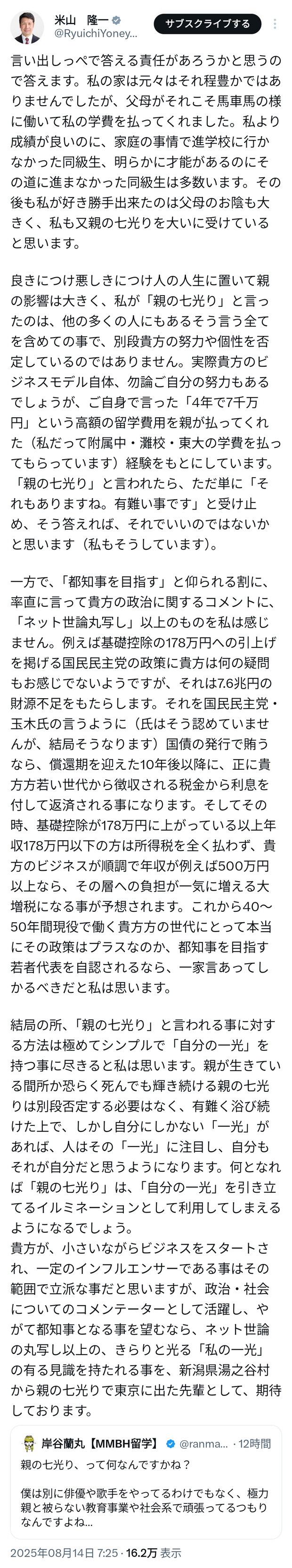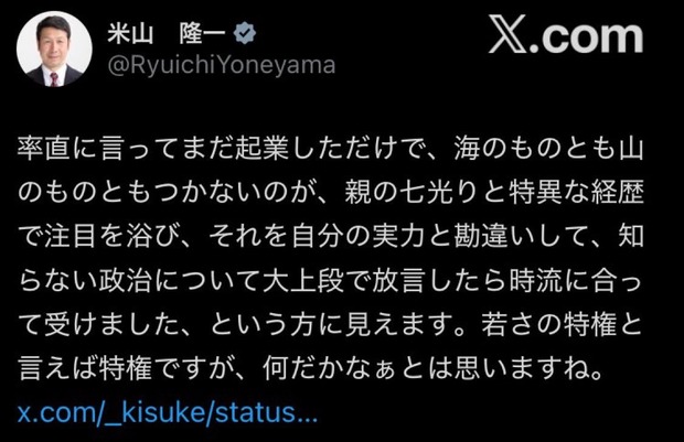 立憲米山、岸谷五朗息子を親の七光りと断罪し炎上、長文言い訳をかます