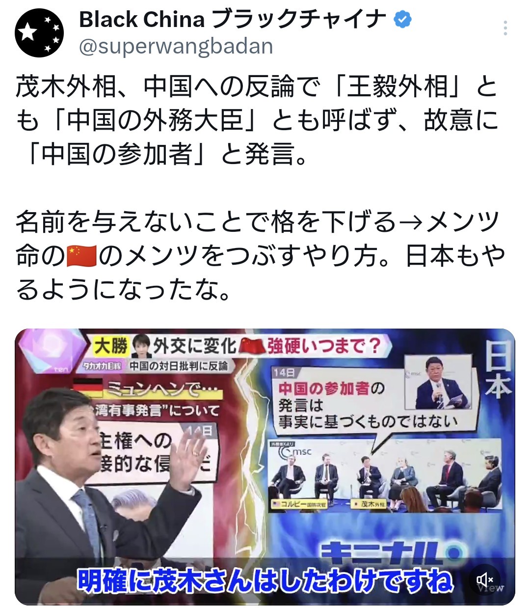 茂木外相、中国への反論で「王毅外相」とも「中国の外務大臣」とも呼ばず、故意に「中国の参加者」と発言。名前を与えないことで格を下げる→メンツ命の🇨🇳のメンツをつぶすやり方。日本もやるようになったな。