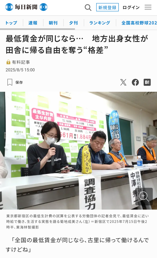 「全国の最低賃金が同じなら、古里に帰って働けるんですけどね」 東京都新宿区在住でスーパーのアルバイトとして働く菊地成美さん(35)は、岩手県や宮城県と県境を接する秋田県東成瀬村の出身だ。 山深い古里を思うと、胸が締め付けられるような思いにかられる。 秋田の高校を卒業して、仙台市の調理専門学校に進んだ。1年で調理師の資格を取り東成瀬村に戻ったが、地元は仕事が少ない上に賃金が低い。(省略)全文最低賃金が同じなら… 地方出身女性が田舎に帰る自由を奪う“格差” | 毎日新聞