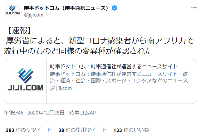 【速報】 厚労省によると、新型コロナ感染者から南アフリカで流行中のものと同様の変異種が確認された