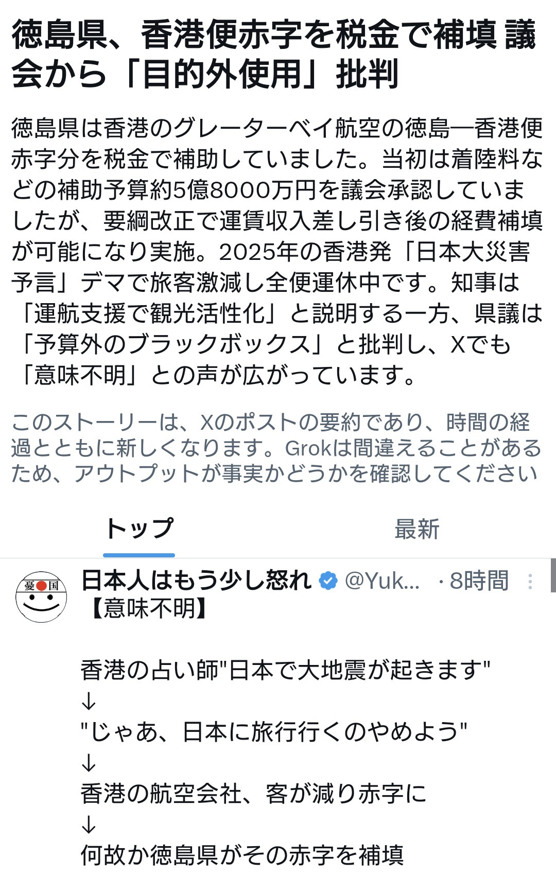 1:2026/03/23(月) 19:29:54.65 ID:M05etAeY0徳島県、香港航空赤字を税金補填 予言デマ影響で議会批判 / Xhttps://x.com/i/trending/2035638796377878850