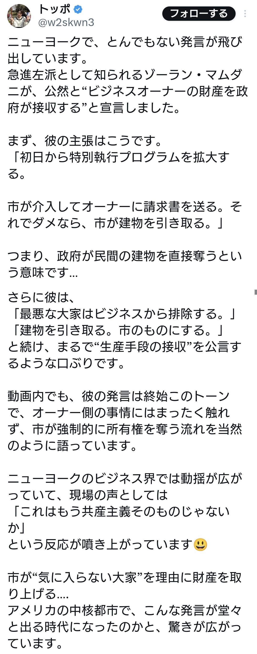 ニューヨークで、とんでもない発言が飛び出しています。急進左派として知られるゾーラン・マムダニが、公然と“ビジネスオーナーの財産を政府が接収する”と宣言しました。まず、彼の主張はこうです。「初日から特別執行プログラムを拡大する。…
