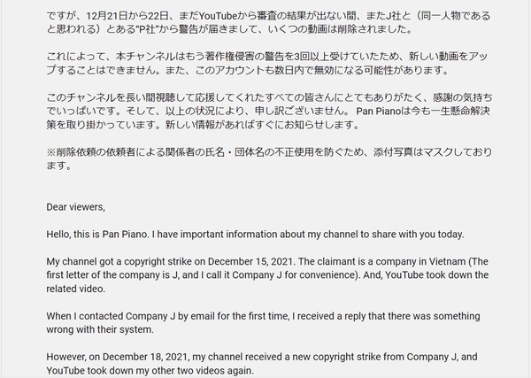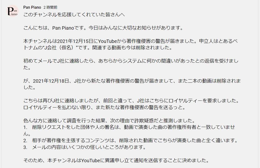 Pan Pianoさん、グエンの著作権侵害詐欺により垢BANか?