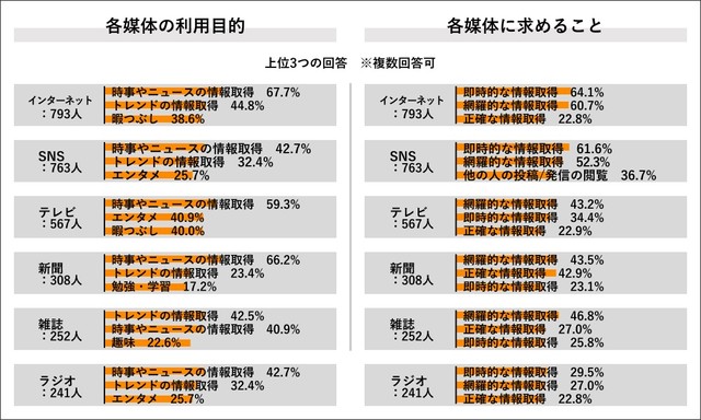 普段利用している媒体では「インターネット」が85.5%で最多となり、次いで「SNS」が80.6%、「テレビ」が50.9%の順となった。