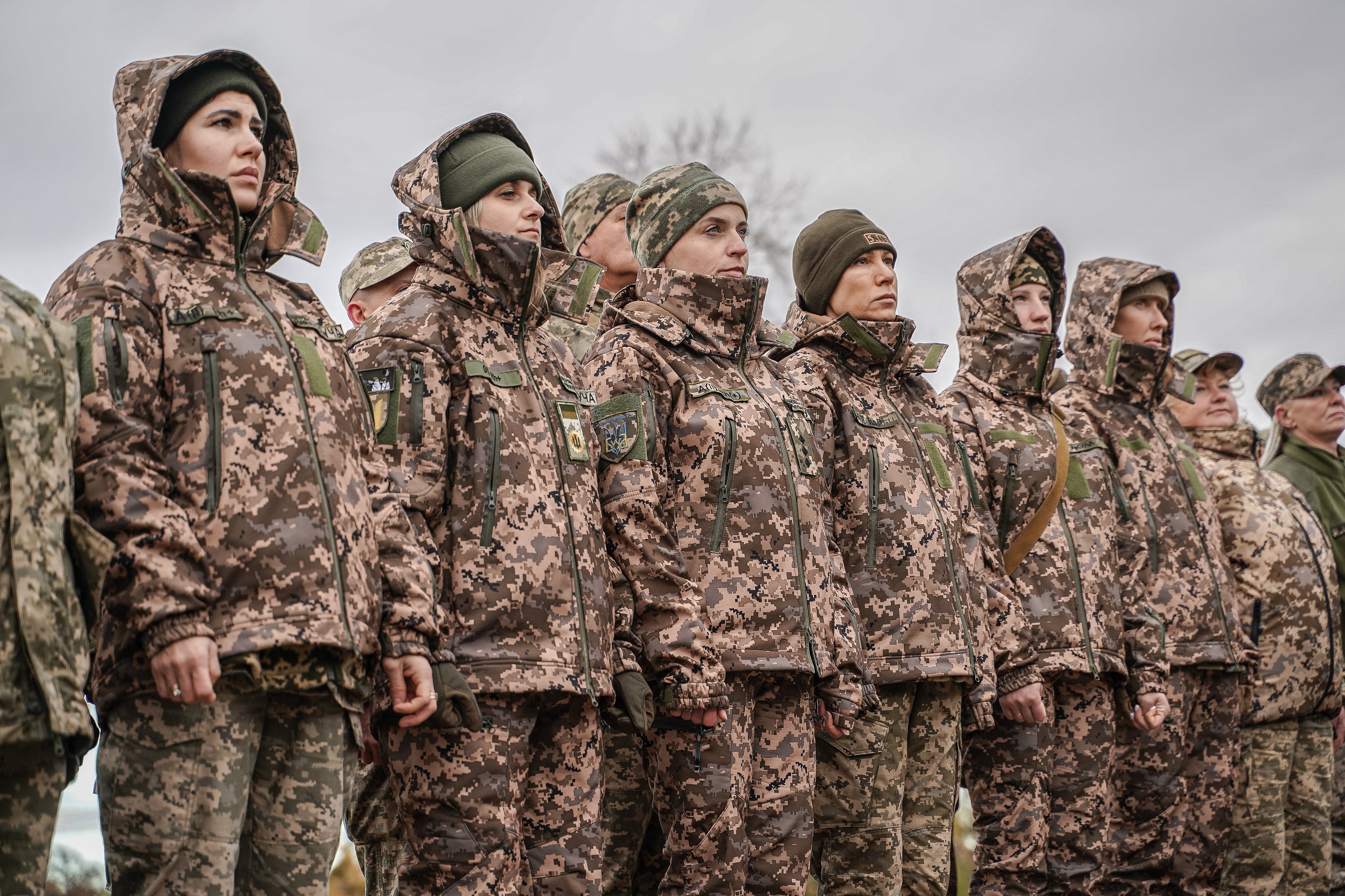 ウクライナ・キーウ州で整列する空軍部隊の女性=2024年11月(ゲッティ=共同)転載元スレッド: