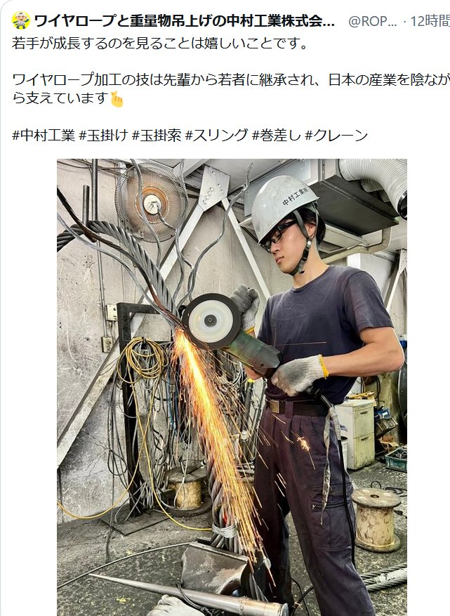 同社は6月9日に問題のツイートを投稿。「若手が成長するのを見ることは嬉しいことです。ワイヤロープ加工の技は先輩から若者に継承され、日本の産業を陰ながら支えています」とのコメントを添えて、作業員の仕事風景の写真を投稿しました。