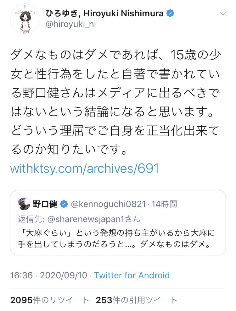 引用元: 【悲報】野口健「大麻、ダメなものはダメ」ひろゆき「15歳の少女と性行為したあなたは?」 ネパールで15歳のシェルパ族の娘・ラムと少し会っただけでまともな会話もせずに父親に許しを得て児童婚・性交、その後二人でカトマンズに移るが「ネパールでは15歳以下とは結婚できない」と知り帰国、ほとんど会わずに二年後に離婚したことを自著で明かしている[70]。なお、離婚の理由については「カトマンズは大都会で会うたびにどんどんケバい女になっていった」ためと説明している[71]。続きを読む