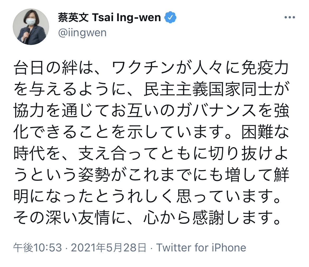 関連ソース中国がワクチン購入を妨害 台湾・蔡英文総統が明らかに|TBS NEWShttps://news.tbs.co.jp/newseye/tbs_newseye4277765.html転載元スレッド:http://hayabusa3.2ch.sc/test/read.cgi/news/1622235969/