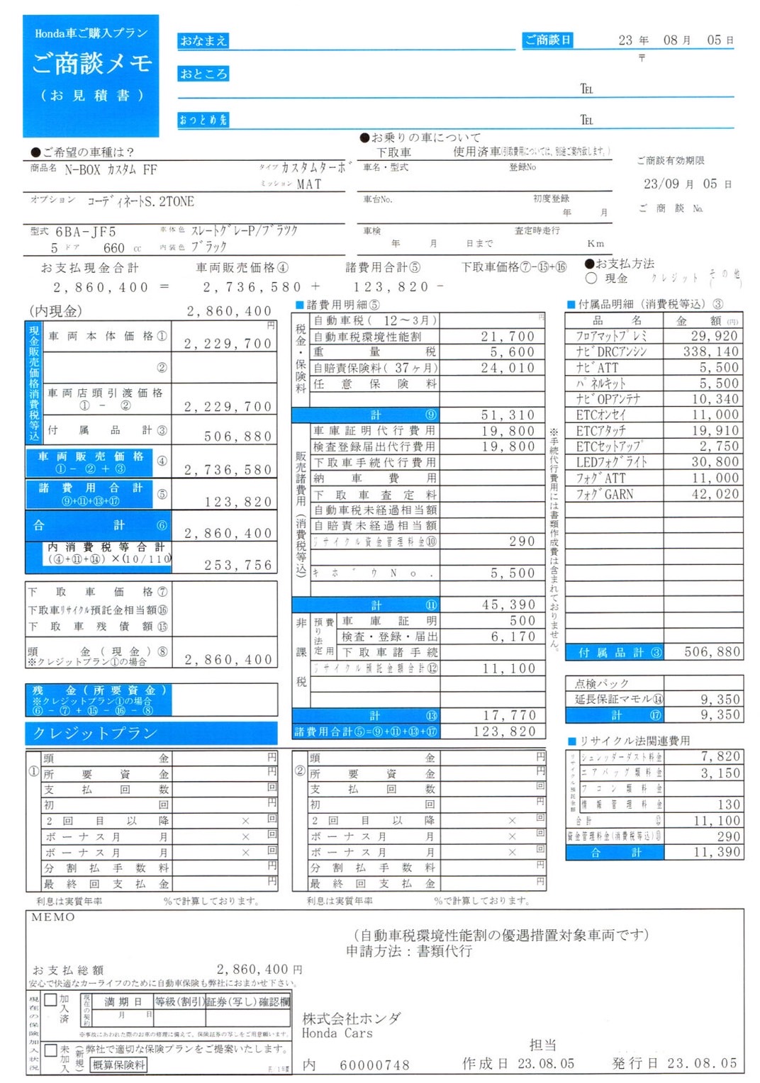 1 風吹けば名無し 2023/08/15(火) 18:06:06.50 ID:3t76CgrS0 N-BOX見積り286万円