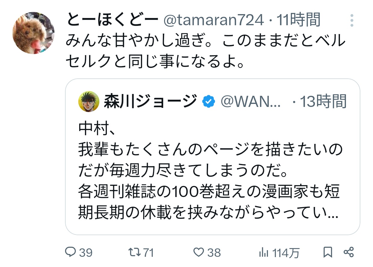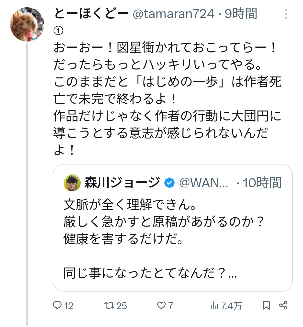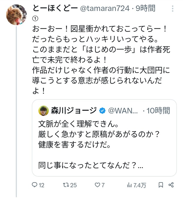 【悲報】はじめの一歩の森川ジョージ先生に直接文句を言った人、ボコボコに大炎上