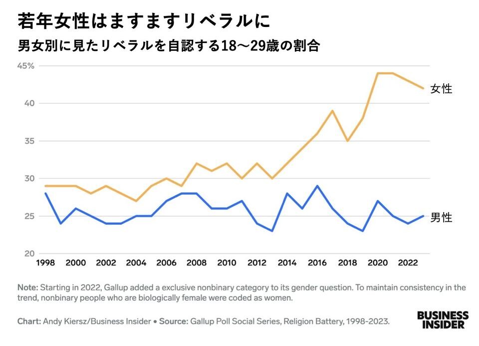 1 名前:名無しさん@おーぷん[] 投稿日:25/07/17(木) 23:37:13 ID:UVtDZ世代の男女の間で「分断」進む。MeTooを機にリベラル化する女性、保守化する男性https://www.businessinsider.jp/article/283311/2014年以降、18~29歳の女性は毎年着実によりリベラルになりつつあるが、若い男性はそうではない。ジェンダーギャップはアメリカ政治の永続的な特徴ではあるが、この四半世紀で若年の男女の見解にこれほど急激な隔たりが生じたことはかつてなかった。この急激な変化は、就学率の向上や信仰心の低下といった単なる新しい人口統計上のパターン以上に、重要な何かが起きていることを示唆している。2 名前:名無しさん@おーぷん[] 投稿日:25/07/17(木) 23:37:20 ID:UVtD