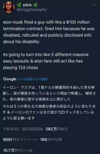 【悲報】イーロン「障害者雇用はクビでw」→障害社員「解雇時に1億ドル貰う契約ですけど」→全力土下座