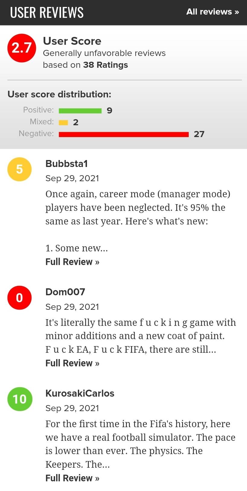 2:名無しさん必死だな:2021/09/30(木) 15:17:35.29 ID:yddM6M4mp.net何やらかしたんだコレ この評価はクソゲーとかじゃなくて別の原因だろ4:名無しさん必死だな:2021/09/30(木) 15:19:29.92 ID:19zMcw0Gp.net進行不具合あるとか?5:名無しさん必死だな:2021/09/30(木) 15:22:15.06 ID:N8vluiNGd.netサッカーゲームって毎年売ってるのに全く進化しないからな