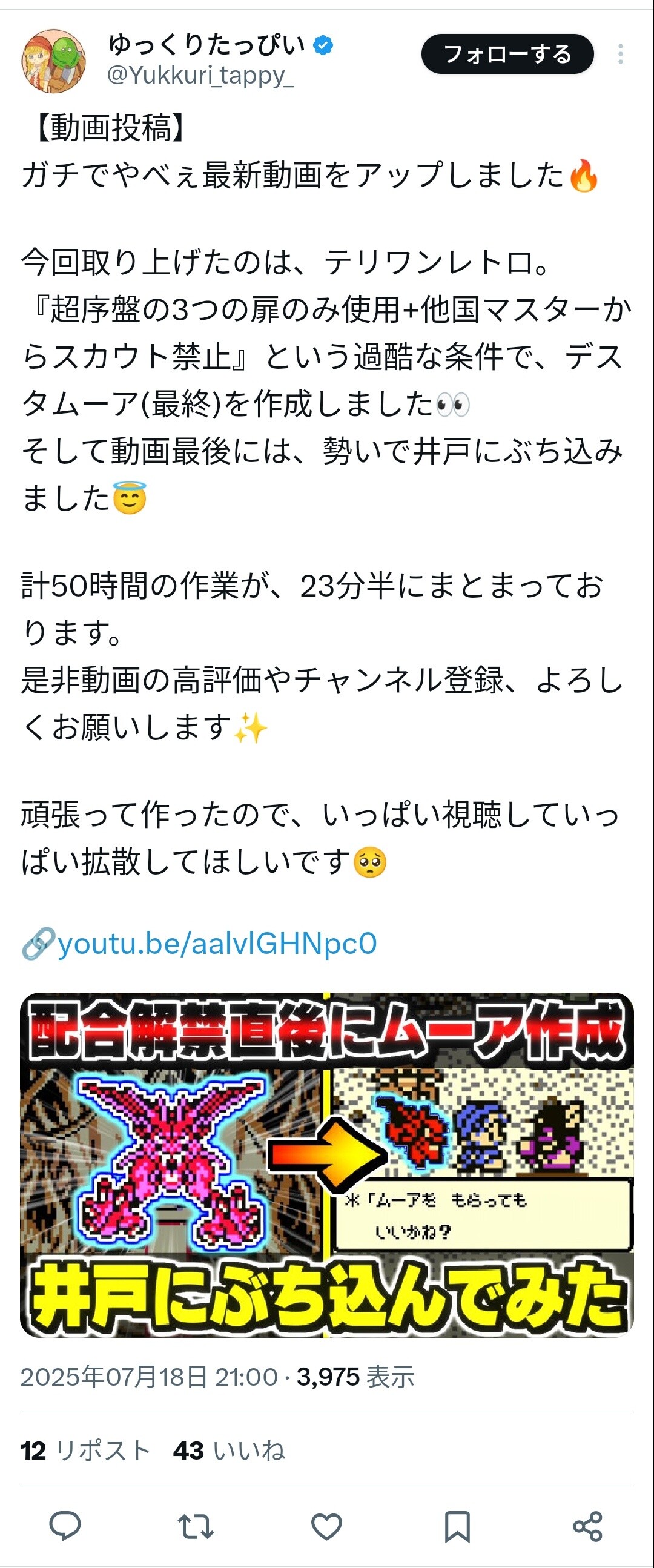 【悲報】世界一ドラクエをやり込んだユーチューバーさん、大学生が50時間かけて配信した企画丸パクりして動画作ってしまうwww