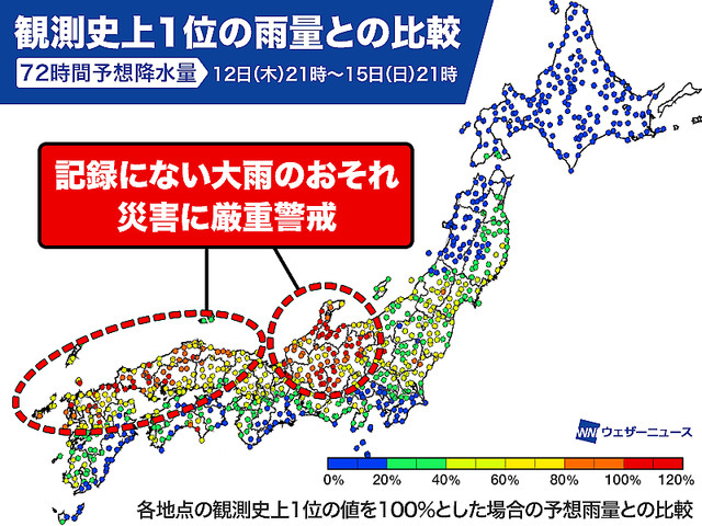 各地で過去最大降雨量の80%~120%の降雨予測wwwwwwwwww