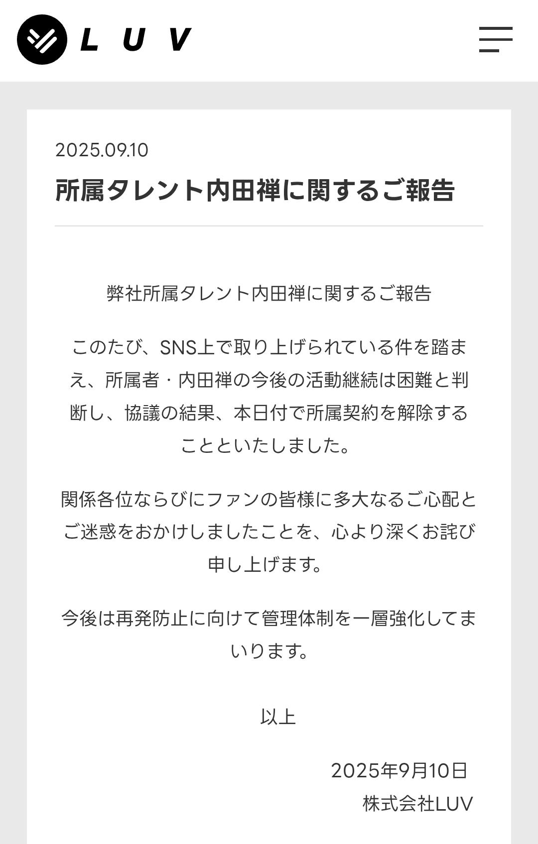 1 名前:名無しさん@おーぷん[] 投稿日:25/09/13(土) 03:49:42 ID:2g9i【話題】爽やかイケメンタレント(20)さん、男性向け風俗勤務バレで芸能事務所から契約解除され波紋▼内田禅さん・若者に人気の恋リア「今日、好きになりました。」等に出演・辻希美さんらが所属するLUV社に所属→男性向け風俗に“売り専ノンケ”として勤務していることを晒され契約解除▼主な反応・なぜ堂々と風俗をやってしまうのか…・事務所は少しくらい守ってやれよ・事務所の「再発防止に努める」がなんかジワる・なんだよ売り専ノンケって・↑清純派AV女優並みに矛盾してる・令和なんだし風俗くらい許したれや