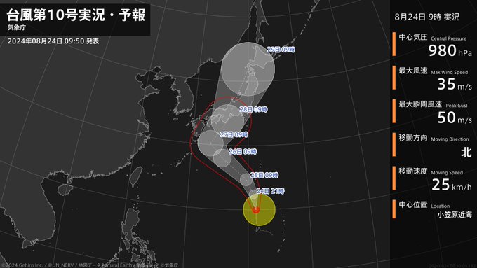 【台風第10号実況・予報 2024年08月24日 09:50】強い台風第10号(サンサン)は、小笠原近海を1時間に25キロの速さで北に進んでいます。 pic.twitter.com/fExOZMjw1Q— 特務機関NERV (@UN_NERV) August 24, 2024 2 名前:名無しさん@おーぷん[] 投稿日:24/08/24(土) 10:14:39 ID:rJx6パンダみたいな名前やな3 名前:名無しさん@おーぷん[] 投稿日:24/08/24(土) 10:14:59 ID:3RL3旅行や6 名前:名無しさん@おーぷん[] 投稿日:24/08/24(土) 10:15:30 ID:qSK1木曜から北海道行く予定やったけど終わりやね7 名前:名無しさん@おーぷん[] 投稿日:24/08/24(土) 10:15:30 ID:dlum沖縄も入れたってや8 名前:名無しさん@おーぷん[] 投稿日:24/08/24(土) 10:15:56 ID:KjFe>>7いつも来てるしええやろ続きを読む