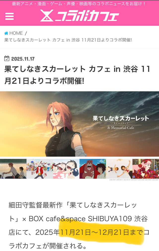 昨日(7日)に映画公式アカウントが「残り1週間」とポストした模様『果てしなきスカーレット & Memorial Cafe』 ??いよいよ終了まで…あと1週間限定コラボメニューやオリジナルグッズなど盛りだくさん?????まだ来られていない方も、もう一度楽しみたい方も、ラストチャンスをお見逃しなく!▼詳細はこちらhttps://t.co/6aBkhYT2Ds https://t.co/YrP4Wg6UDI— 【公式】『果てしなきスカーレット』@スタジオ地図 (@studio_chizu) December 7, 2025 2 名前:名無しさん@おーぷん[] 投稿日:25/12/08(月) 14:29:29 ID:lGgs大赤字さんさぁ・・・ww4 名前:名無しさん@おーぷん[] 投稿日:25/12/08(月) 14:30:06 ID:exZM人来るんかこれ5 名前:名無しさん@おーぷん[] 投稿日:25/12/08(月) 14:30:40 ID:6XjWなんでサマウォのセリフ使ってんの?スカに名言ないの?続きを読む