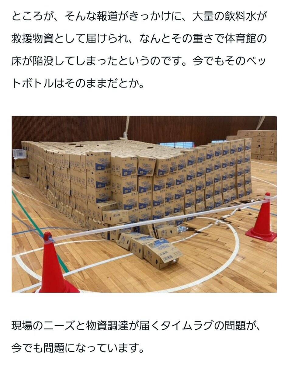 ところが、そんな報道がきっかけに、大量の飲料水が救援物資として届けられ、なんとその重さで体育館の床が陥没してしまったというのです。今でもそのペットボトルはそのままだとか。