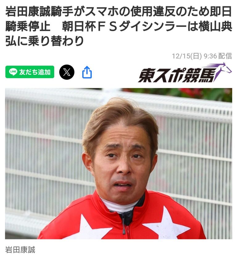 岩田康誠騎手がスマホの使用違反のため即日騎乗停止 朝日杯FSダイシンラーは横山典弘に乗り替わり