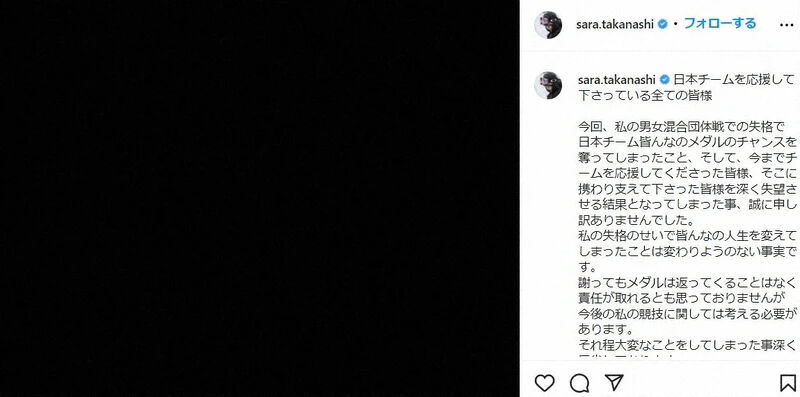 真っ黒な画像を示した上で「私の失格のせいでみんなの人生を変えてしまったことは変わりようのない事実です。謝ってもメダルは返ってくることはなく責任が取れるとも思っておりませんが、今後の私の競技に関しては考える必要があります。それほど大変なことをしてしまったこと、深く反省しております」とし、「私のせいでメダルを取れなかったにもかかわらず、最後の最後まで支え続けてくれた(伊藤)有希さん、(佐藤)幸椰さん、(小林)陵侑、そして日本チームのメンバーの皆さま、スタッフの皆さまには感謝してもしきれません。こんな私を受け入れてくれて本当にありがとうございました。この度は本当に申し訳ありませんでした」と記した。