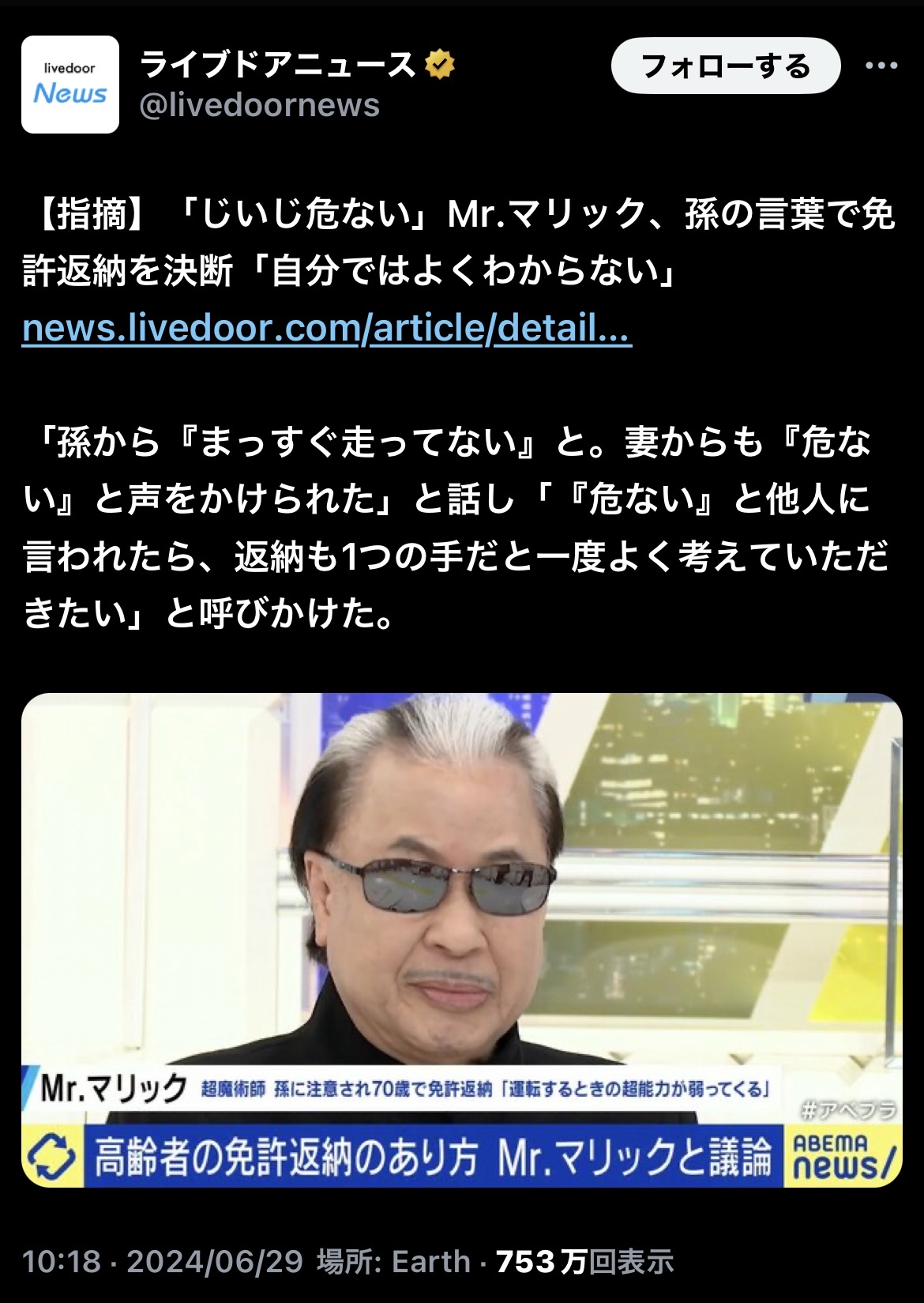 【指摘】「じいじ危ない」Mr.マリック、孫の言葉で免許返納を決断「自分ではよくわからない」