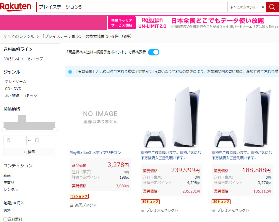 ヨドバシカメラは1日ずらし19日からの予約となり、実際に予約されたのはビックカメラ、ジョーシン、そして10時8分頃に在庫が公開されたアマゾンでは10分ほどで完売となった。編集部もカートに入れる事は出来たもののその先の注文することが出来ず。そんな『PlayStation 5』だが早速転売屋の餌食になっている。アマゾンでは29万円や35万円、最終的には50万円という値段が付けられていた。それだけではなくキャンセル不可としており、キャンセル料5万円や7万円を「迷惑料」という名目で取るという業者まで現れたほどだ。そんな転売業者に対してアマゾンが重い腰をあげたのか、SIEのお達しなのか17時30分頃に全ての業者が一掃された。今までもこのような転売業者はいたが、今回は酷いと睨んだのだろう。そもそも他店が転売防止で条件付きで抽選を行っている中、転売を許してしまっているAmazonも問題である。アマゾンだけでなく楽天も同様に『PlayStation 5』本体が24万円で販売されている。まだ抽選できるので焦って転売業者から購入しないようにしてほしい。予約情報まとめについては下記動画とリンクを参考にしてほしい。https://gogotsu.com/archives/59337https://gogotsu.com/wp-content/uploads/2020/09/PS5_tenbai001.jpg