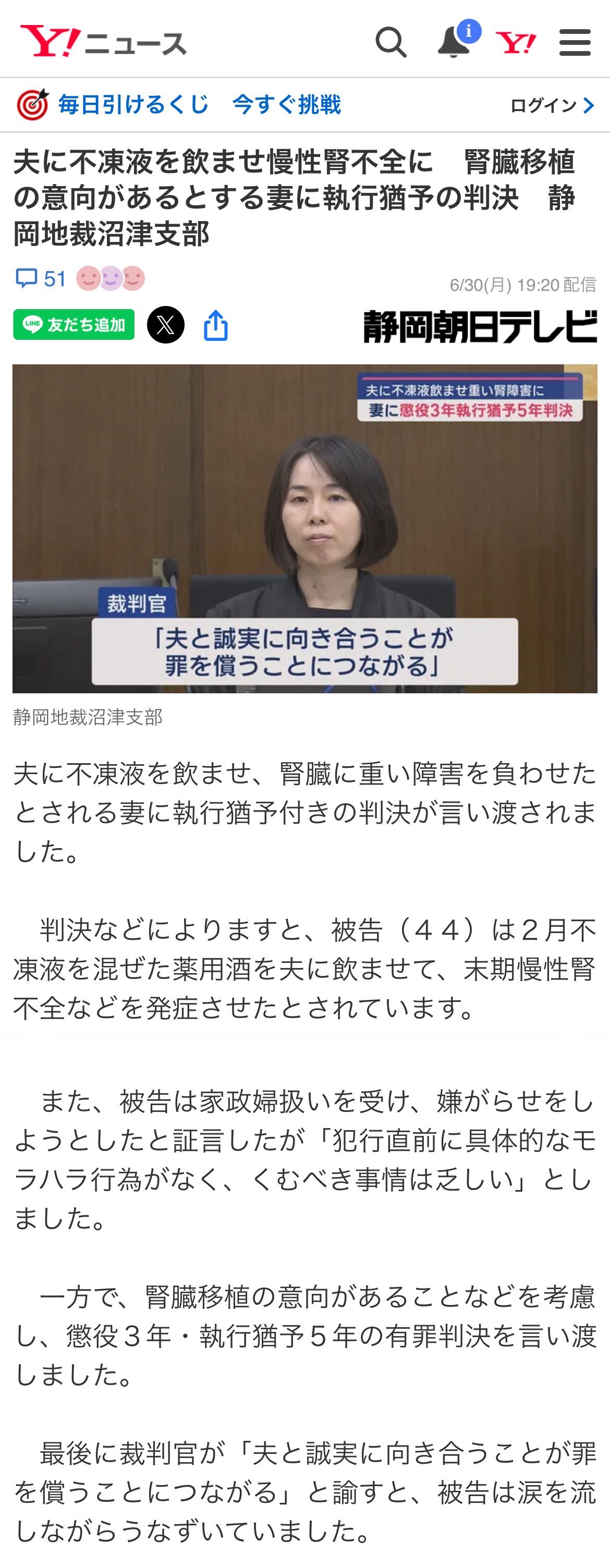 夫に不凍液を飲ませ慢性腎不全に 腎臓移植の意向があるとする妻に執行猶予の判決 静岡地裁沼津支部(静岡朝日テレビ) - Yahoo!ニュース