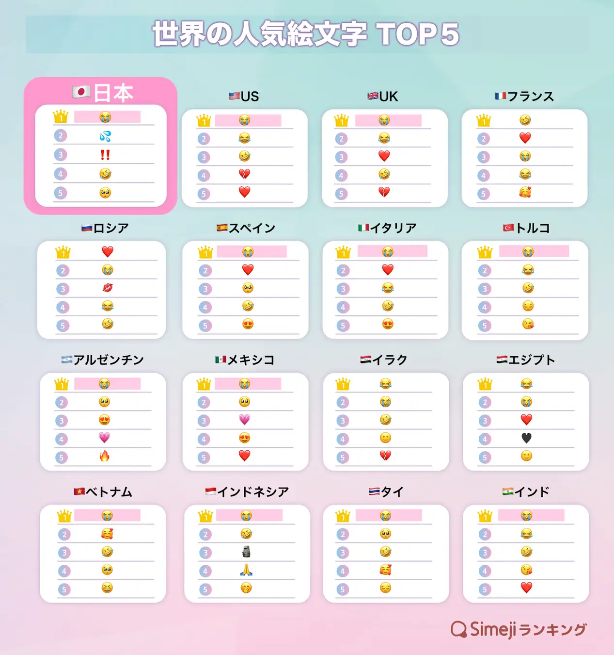 最も使用された絵文字は「大泣き」 IT大手が上半期世界16カ国の絵文字を調査日本やアメリカなど12カ国で「大泣きしている顔」が1位になりました。「大泣き」は万能リアクションこの絵文字は、日本では悲しい時だけでなく、嬉しさや共感など感情が高まった場面で使われる「万能リアクション」として定着しているとしています。また、多くの国で「愛」を表すハート系の絵文字がランクインしましたが、日本は入らず、海外と異なる特徴が見られたということです。https://news.yahoo.co.jp/articles/2490c8ab0198791f5105deb865fe973eba528880続きを読む